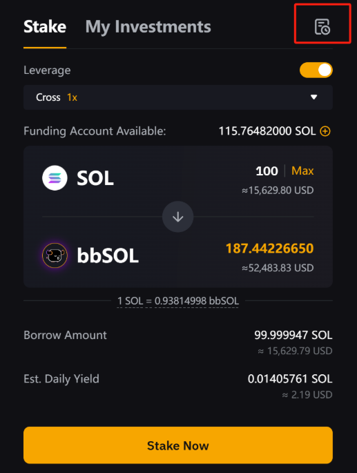 Bước 1: Để kiểm tra lệnh của bạn, nhấp vào biểu tượng lịch sử ở góc trên bên phải của bảng Stake hoặc Khoản Đầu Tư Của Tôi trên trang chủ Margin Staked SOL.