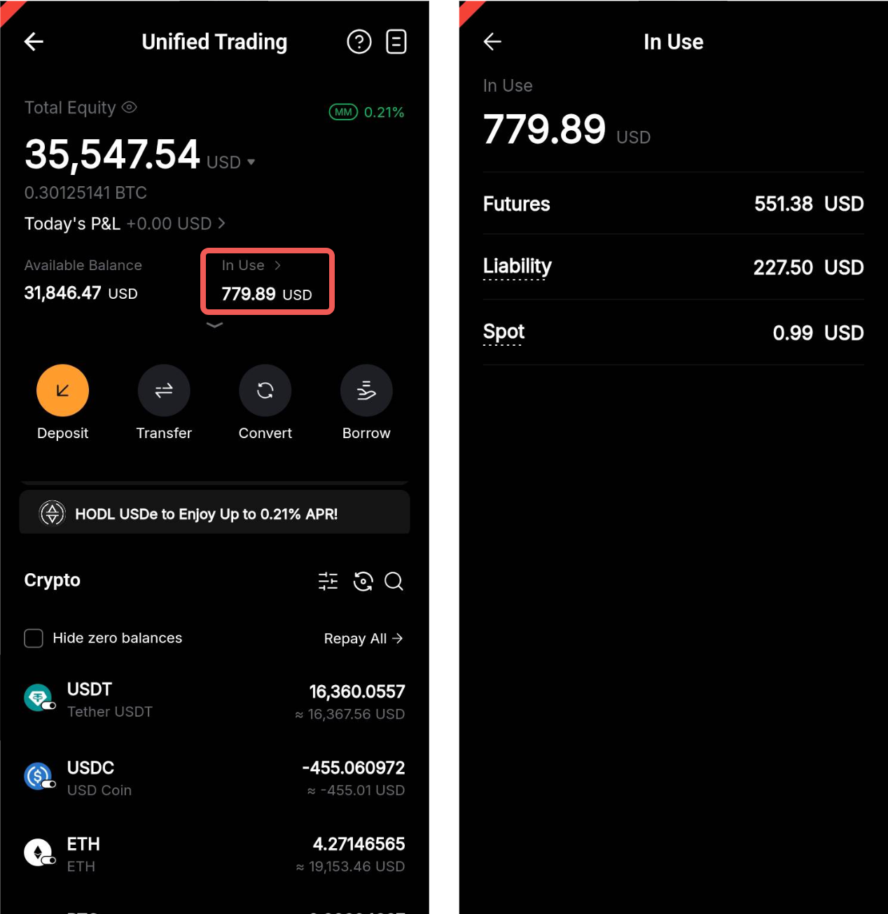 Chế Độ Ký Quỹ Chéo/Ký Quỹ Danh Mục Đầu Tư: Số dư ký quỹ xác định số vốn có thể được dùng để duy trì rủi ro tài khoản và đặt lệnh. Trên Bybit App, bạn có thể xem Tài Khoản Đang Sử Dụng, hiển thị phần số dư ký quỹ hiện đang được sử dụng làm ký quỹ ban đầu.