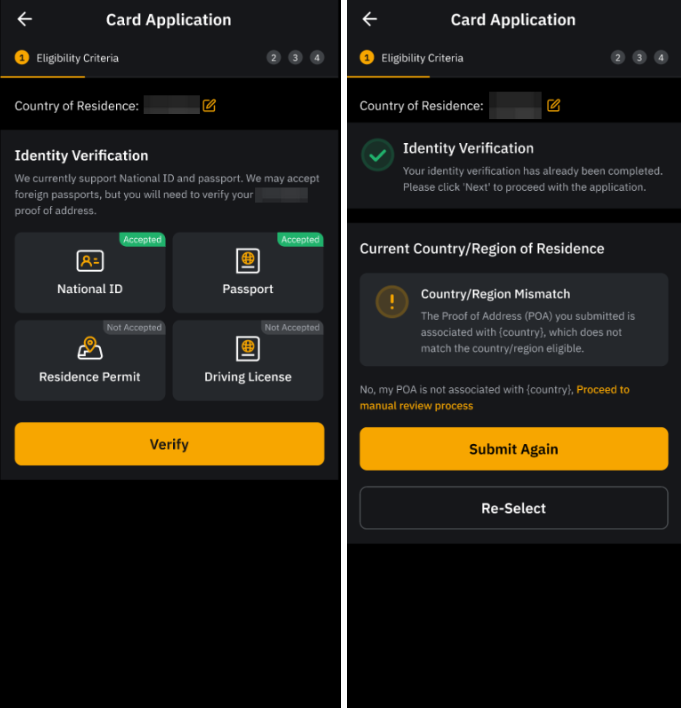 2. 如果您在申请卡之前或期间已经完成高级身份验证,但您的居住国家/地区不符合申请Bybit Card(AIFC),您可以点击重新验证来提交新地址。