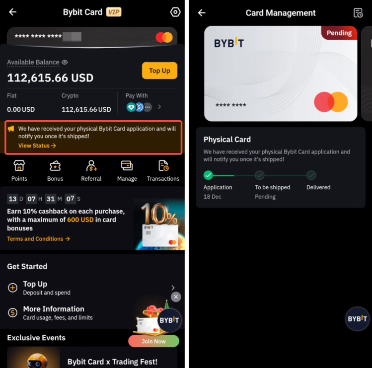 一旦您的申请获得批准,您可以立即开始使用您的 Bybit Card (AIFC),无需额外激活。