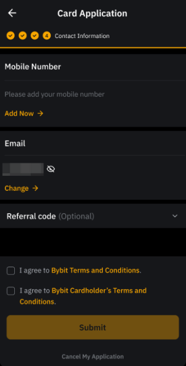 阅读并同意 Bybit 条款和条件以及 Bybit 持卡人条款与条件,然后点击提交