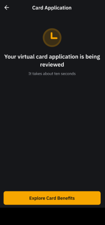 第 6 步:成功提交后,您的虚拟Bybit Card 申请将进入审核阶段,此流程通常需要几分钟时间。 在某些情况下,审查可能需要七 (7) 个工作日。 申请成功后,您将收到电子邮件通知。