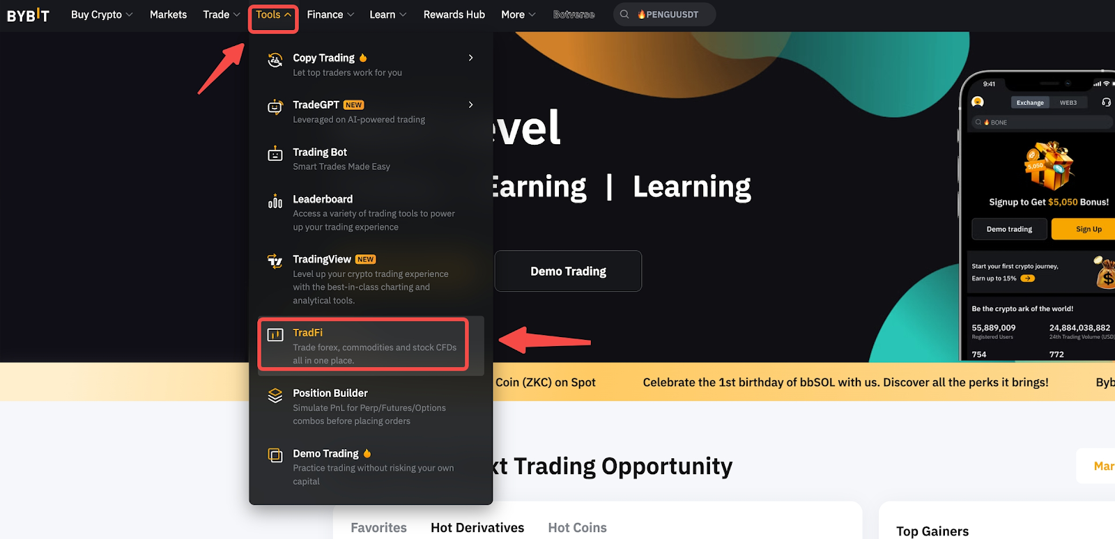 第 1 步: 登录您的 Bybit 帐户,将光标悬停在导航栏上的工具上,然后单击 TradFi。