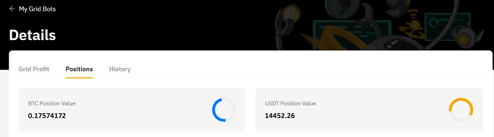 在成功执行网格策略后,若要查看基础代币和报价代币的价值,请点击活跃网格机器人栏右侧的更多 → 详情以进入详情页面,然后选择仓位。