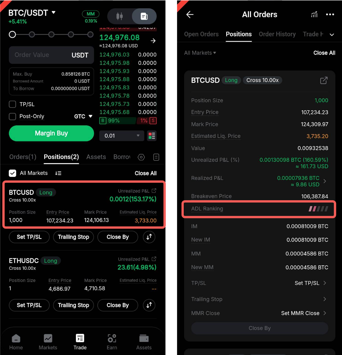 ADL 排名根據頭寸的槓桿回報率確定。 請注意,仍有可能選擇處於虧損狀態的對立頭寸,但盈利頭寸優先。