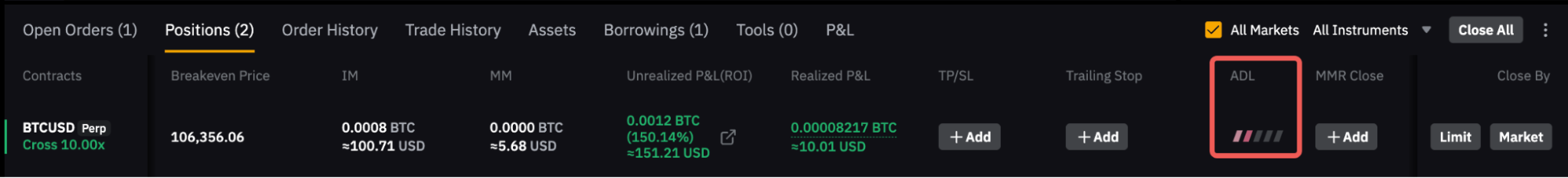 交易員可以從「頭寸」選項卡中查看每個頭寸的 ADL 排名。