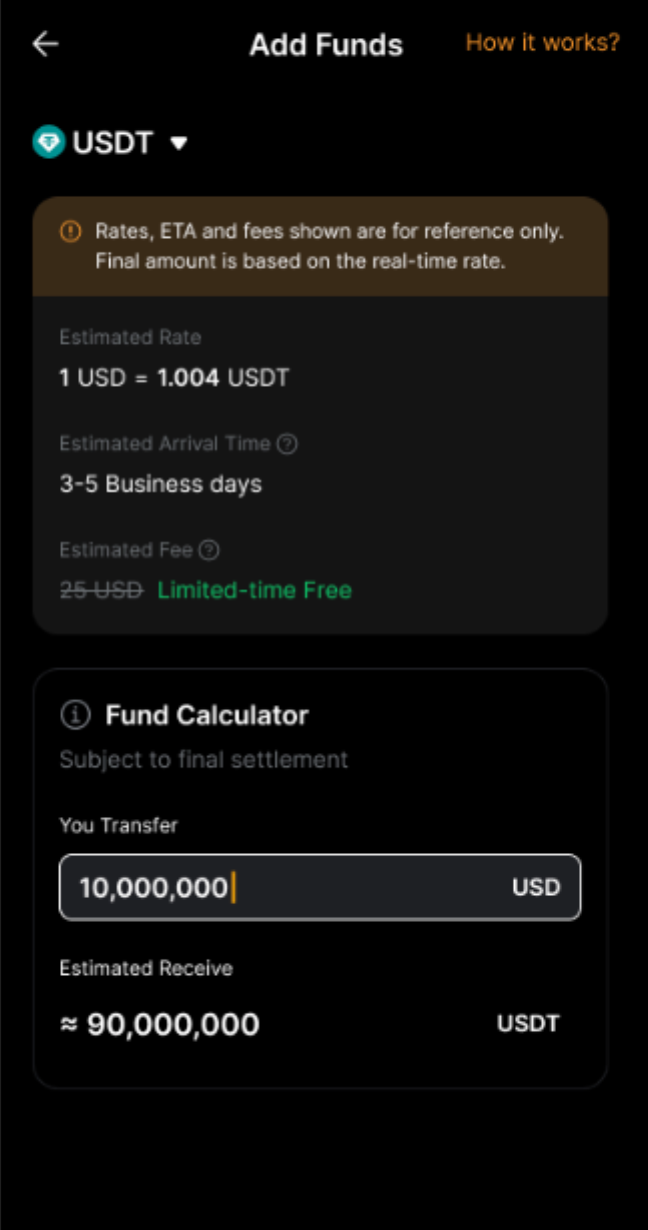 銀行轉賬 + 目前僅支持 USD。所有轉賬均通過 SWIFT 處理。未來可能會引入對其他法币和支付方式的支持。