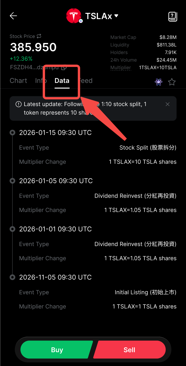 不會,您持有的代幣數量不會因為股票拆分、反向拆股或股息分配而改變。 然而,係數可能會調整,因此每單位代幣所代表的股數可能會改變。 這些調整旨在確保您持倉的整體經濟價值與標的股票的公司行動保持一致。