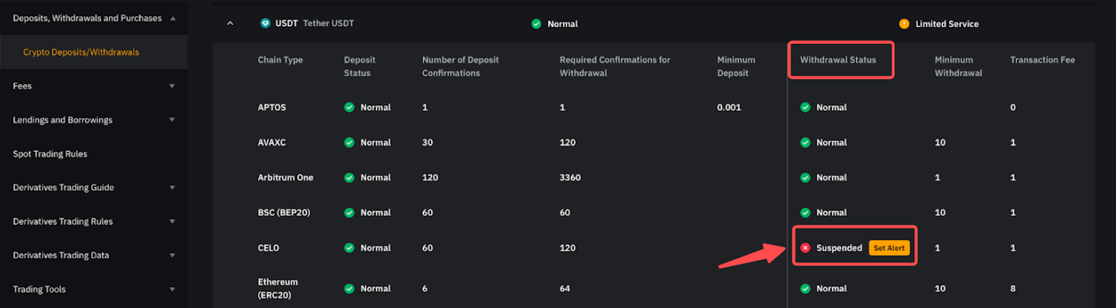 我想提幣,但此代幣/鏈的服務目前已暫停。恢復此特定代幣/鏈服務後,如何收到通知?