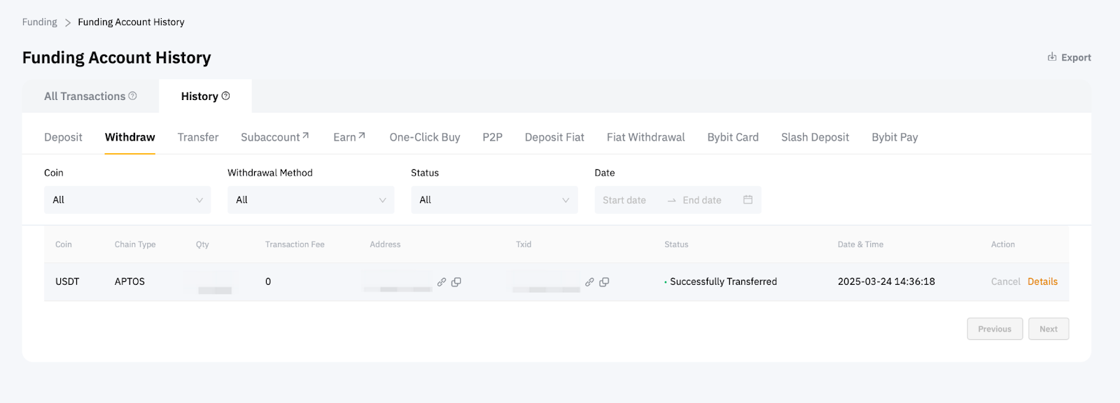 請注意,被視為提幣的行為包括加密貨幣鏈上提幣、內部轉帳、法幣提幣、Bybit Card 交易和 P2P 交易(買賣訂單)。有關更多信息,請參閱提現失敗的常見原因。