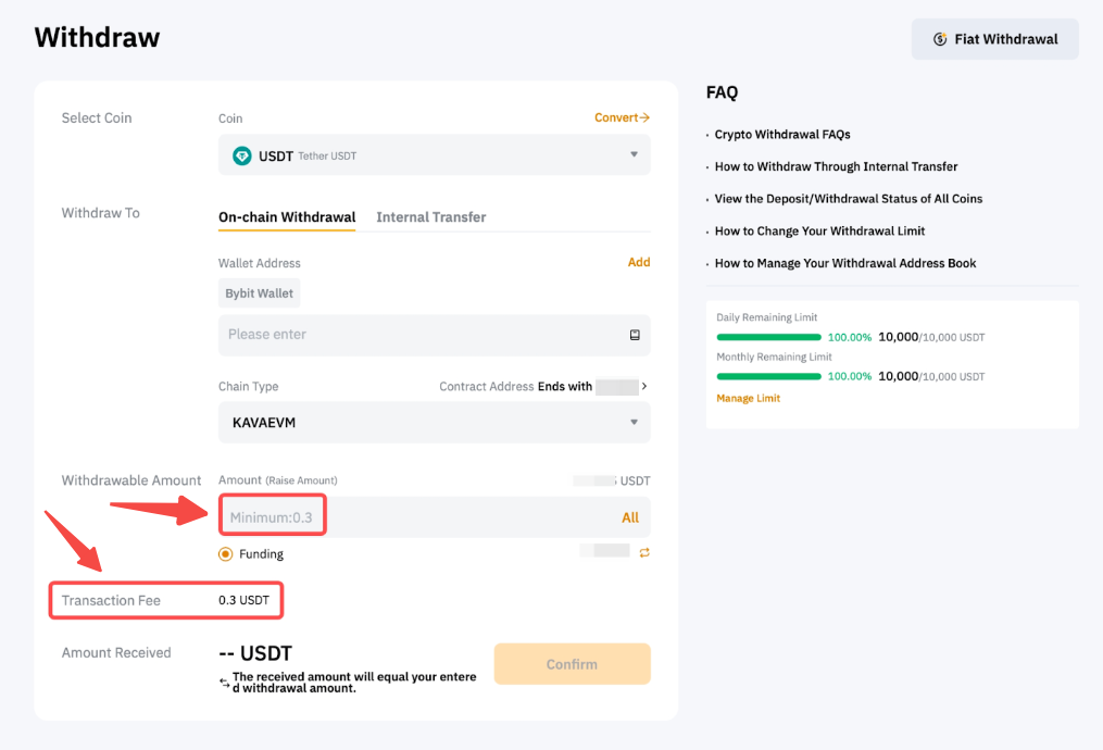 Bybit對所有提現收取固定手續費,並動態調整轉賬礦工費至更高水平,以保證提現在區塊鏈上擁有更快的確認速度。