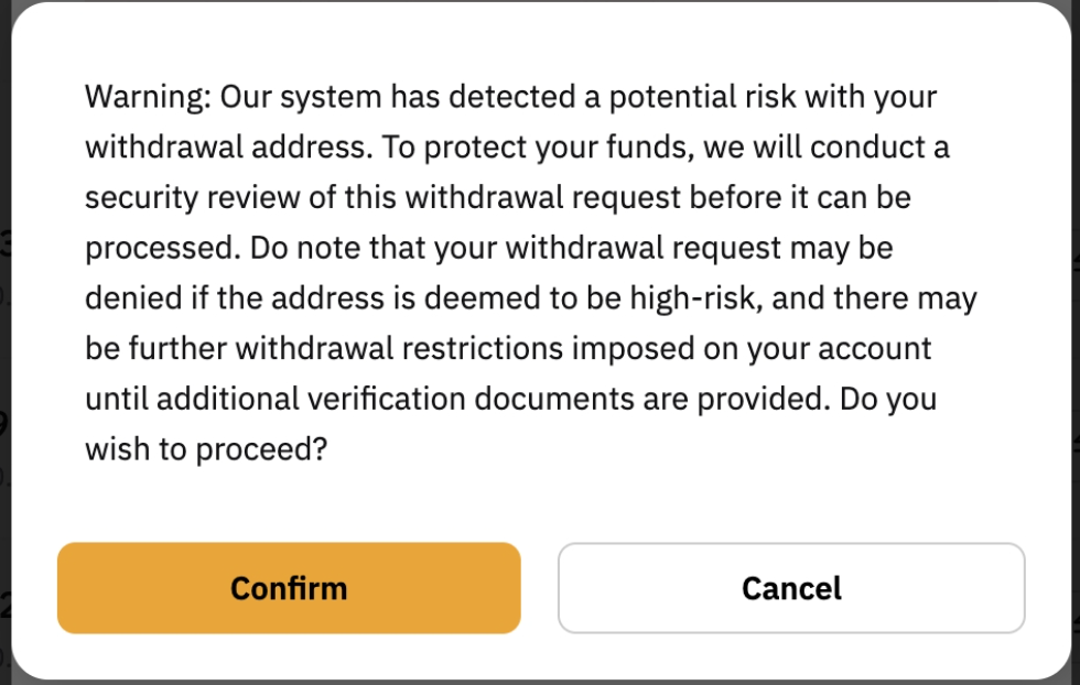 當系統檢測到提現地址存在任何潛在安全風險時,我們強烈建議您考慮使用其他提現地址。