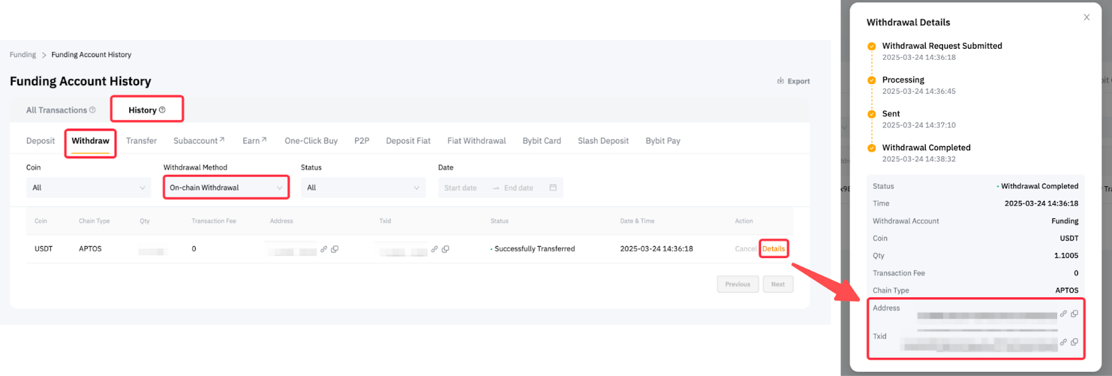 您可以在資金賬戶歷史→提現頁面取得TXID,點擊詳情查看您的提現地址和TXID。