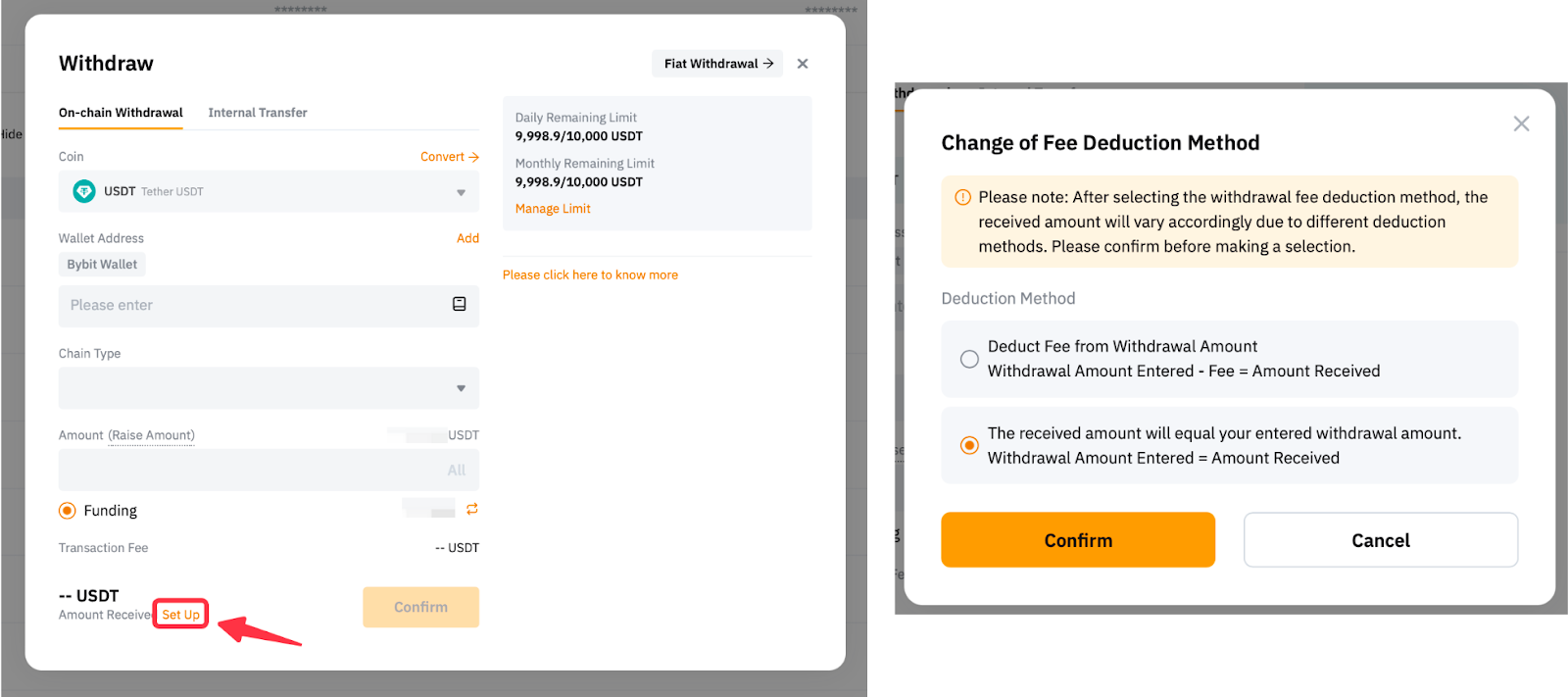 預設情況下,提現費用將從指定的提現金額中扣除。但是,可以透過點擊設定並選擇首選扣除方法來修改此設定。
