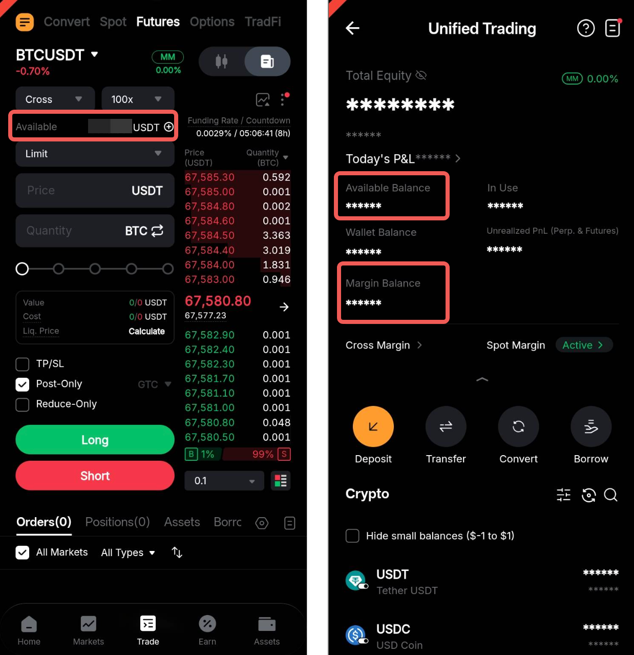 保證金餘額僅與 UTA 全倉保證金和組合保證金模式相關。指可用作帳戶保證金的總金額,包括錢包餘額和永續合約未結盈虧。如果保證金餘額低於維持保證金,則會觸發強平。請注意,在考慮資產指數價格和抵押品價值比率後,該價值為折算價值,而不是您帳戶中實際持有的 USD 金額。