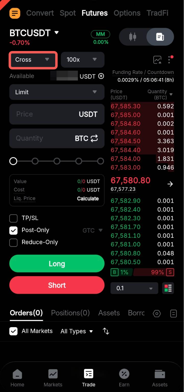 您可以在任何交易頁面或統一交易帳戶資產頁面切換保證金模式。請注意,要切換到全倉保證金模式,雙向部位(做多和做空倉位)的槓桿和風險限額必須相同。否則,切換將會失敗。欲了解詳情,請參閱此處所述的保證金模式切換標準。