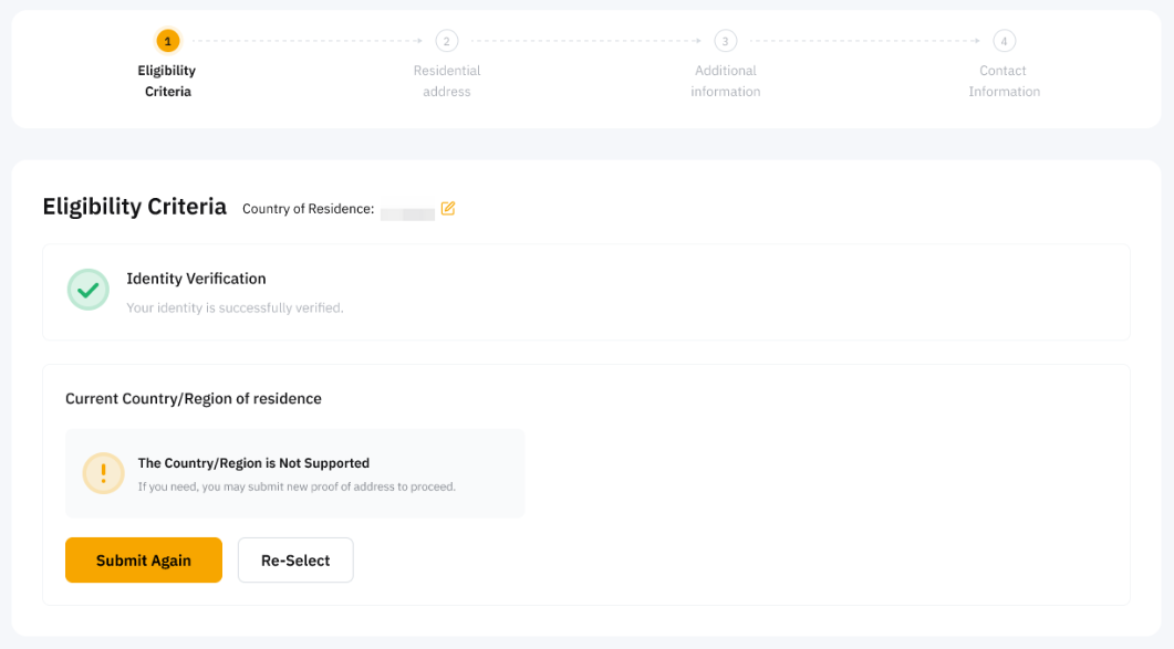2. 如果您在申請信用卡之前或期間已經完成了進階身份驗證,但您的居住國家/地區不符合申請Bybit Card(AIFC),您可以點擊重新驗證来提交新地址。