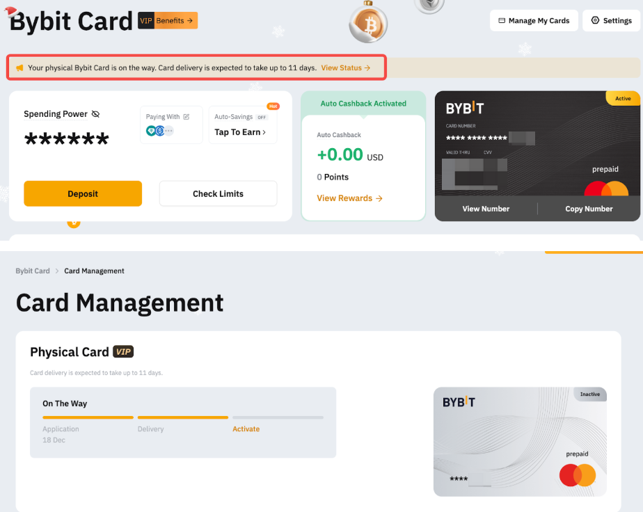 — 如需了解更多關於卡片外送狀態說明,請參考常見問題 — Bybit Card 一般查詢(AIFC)