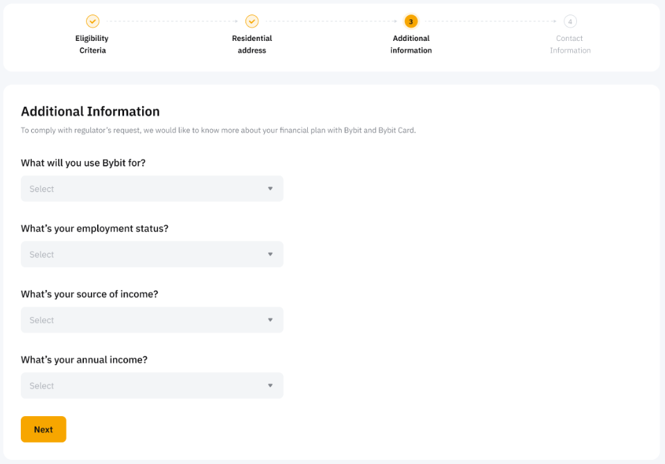 步驟 4:聲明您打算使用 Bybit Card,並提供其他資訊,包括您的就業狀態、收入來源和年收入。
