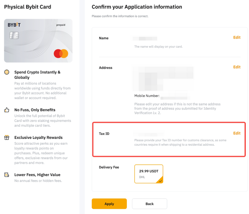 — 如果修改後的位址與您的虛擬 Bybit Card 位址認證不一致,Bybit 有權拒絕任何位址更改申請。我們目前不支持提交地址證明來更改送貨地址。