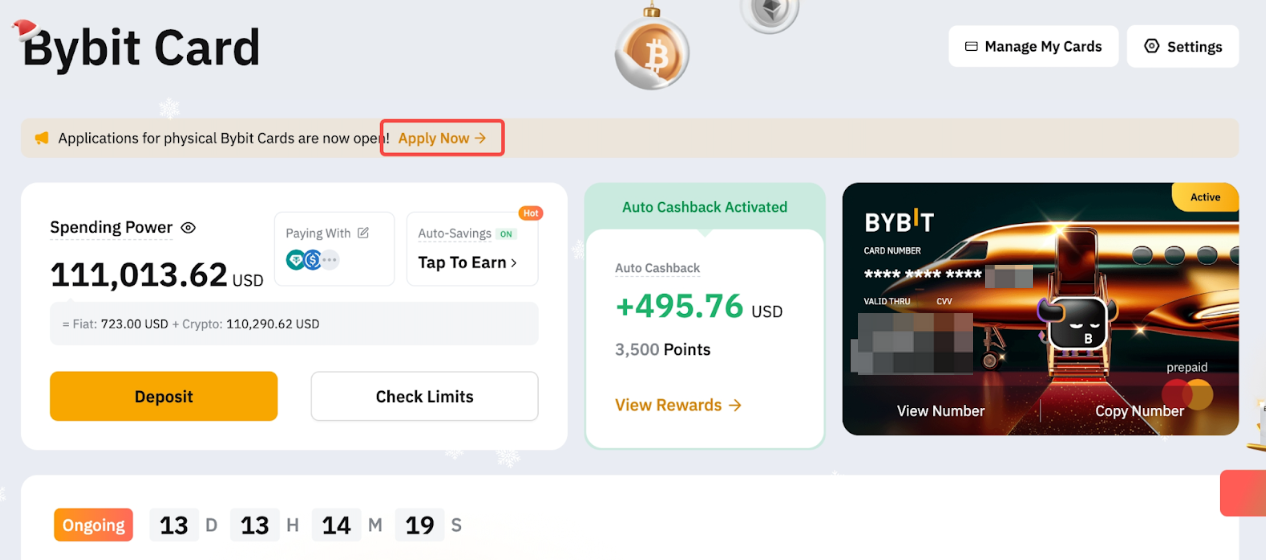 Bybit Card 是一款 Mastercard 預付卡,可讓您隨時隨地便利、安全地使用您的法幣及數字資產進行消費。 我們提供虛擬Bybit Card 供您進行線上支付,以及實體Bybit Card 供您在店內使用。 本文將指導您如何申請 Bybit Card。