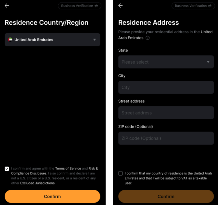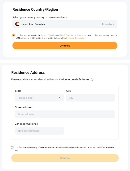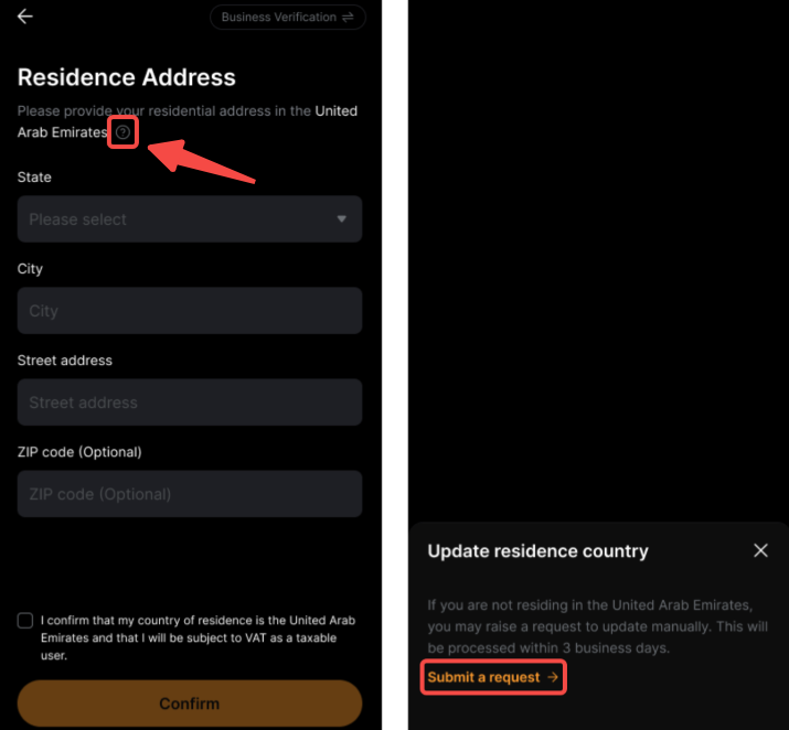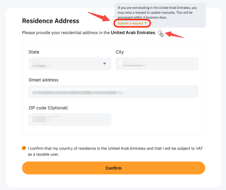 2. 輸入您的居住地址,並勾選複選框以確認您是阿拉伯聯合大公國居民,且為應稅用戶,須繳納加值稅 (VAT)。