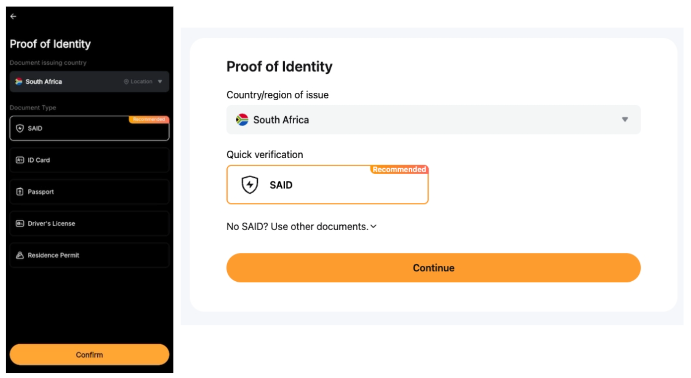 南非居民可以使用當地證件類型完成身份認證:SAID(南非身份證)。