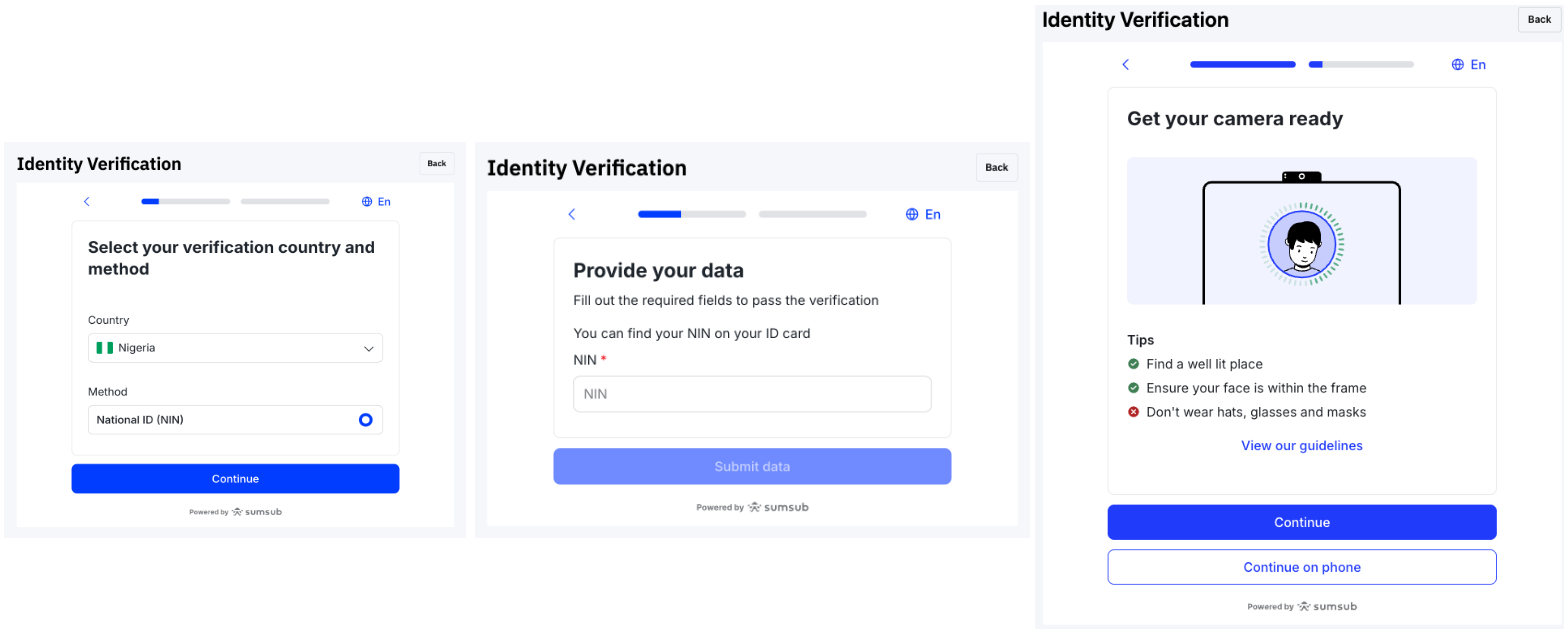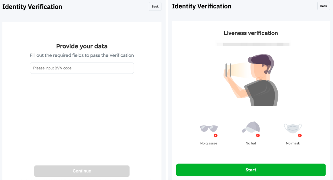 尼日利亞居民支援兩 (2) 種本地證件認證類型:銀行驗證碼 (BVN) 和身分證字號 (NIN)。