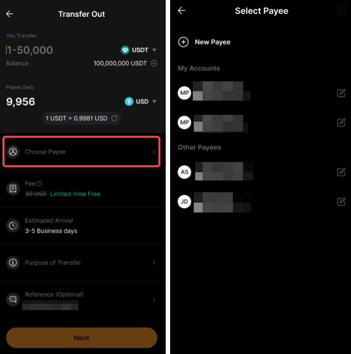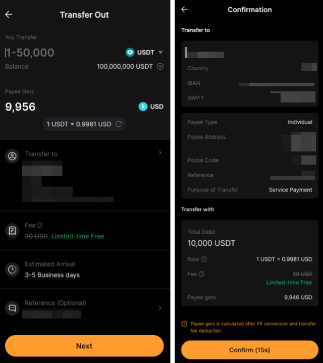 – 收款銀行帳戶不一定需要是您本人名下的帳戶。支援轉帳至第三方銀行帳戶。
