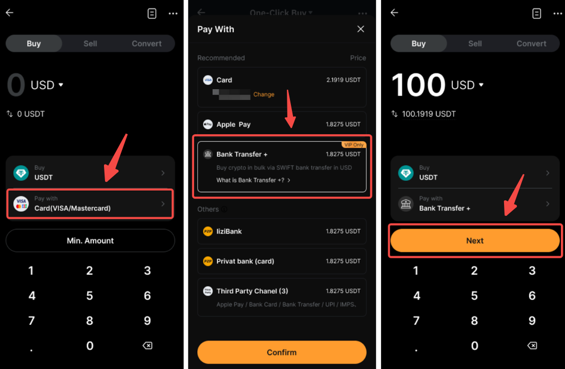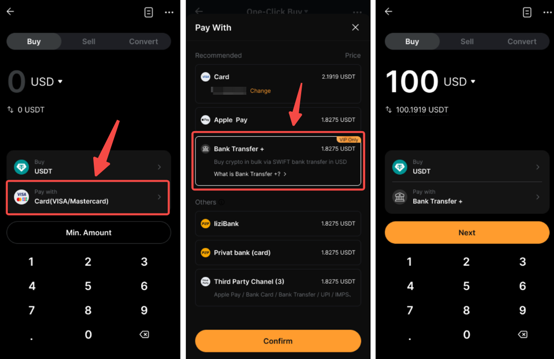 步驟 1: 前往 購買加密貨幣頁面,選擇 銀行轉賬 + 作為您的支付方式,點按 使用,然後點按下一頁以繼續操作。