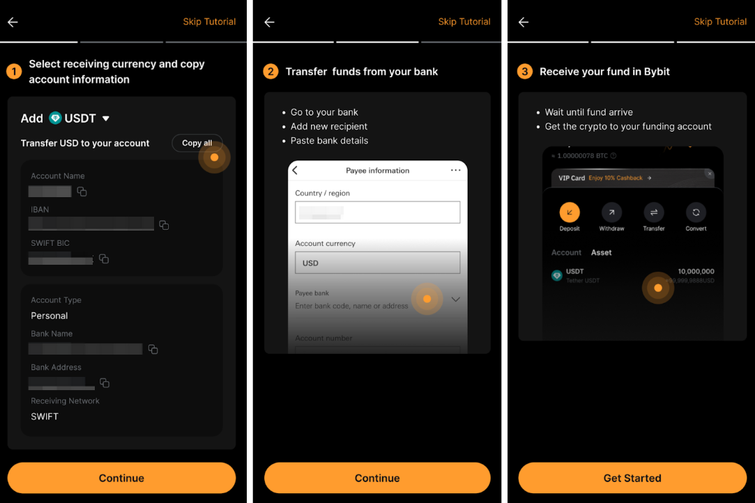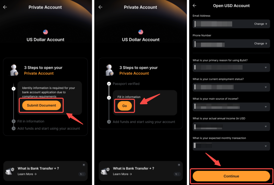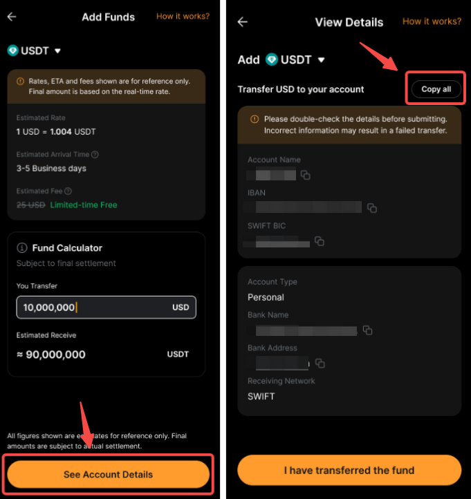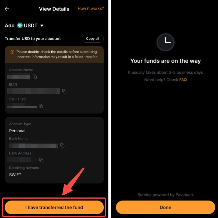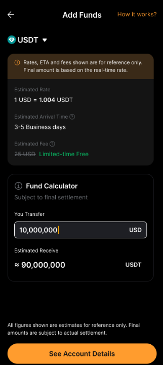 在設定銀行轉賬+後,您可以從您的銀行帳戶轉帳法幣,並在您的資金賬戶中接收 USDT 或 USDC。