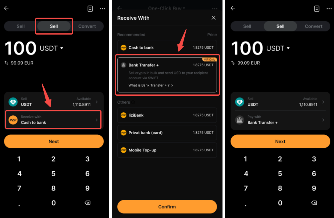 步驟 1: 前往購買加密貨幣頁面,並切換至出售選項卡。確保您的收款方式設定為銀行轉賬 +,然後點擊下一頁繼續。
