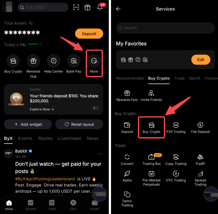 步驟 1: 在您的 Bybit App 的 首頁頁面中,點擊 更多 →購買加密貨幣.