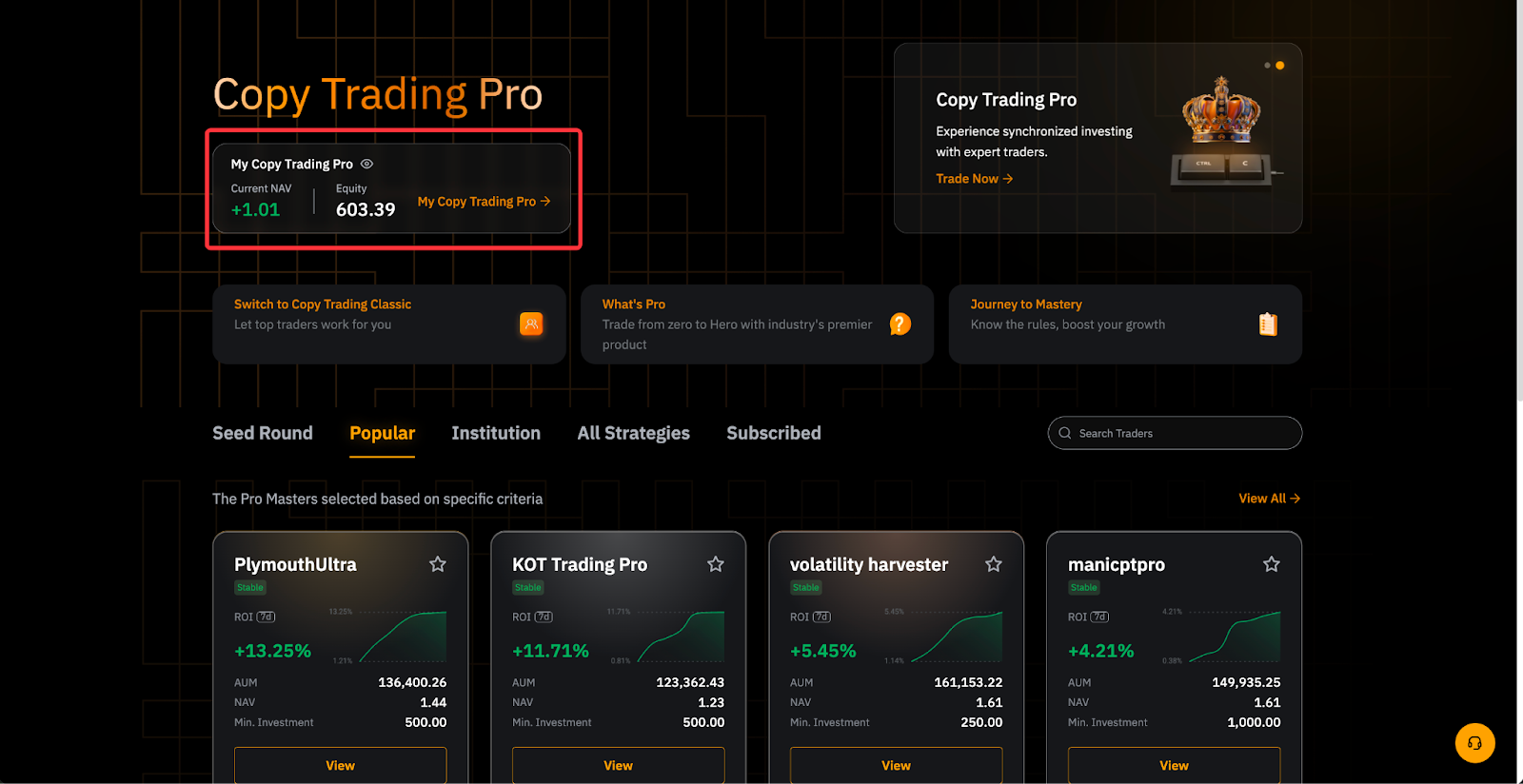 前往跟單交易 Pro → Pro 達人中心。 您可以點選產品頁面左上角的跟單交易 Pro 策略摘要卡存取頁面。