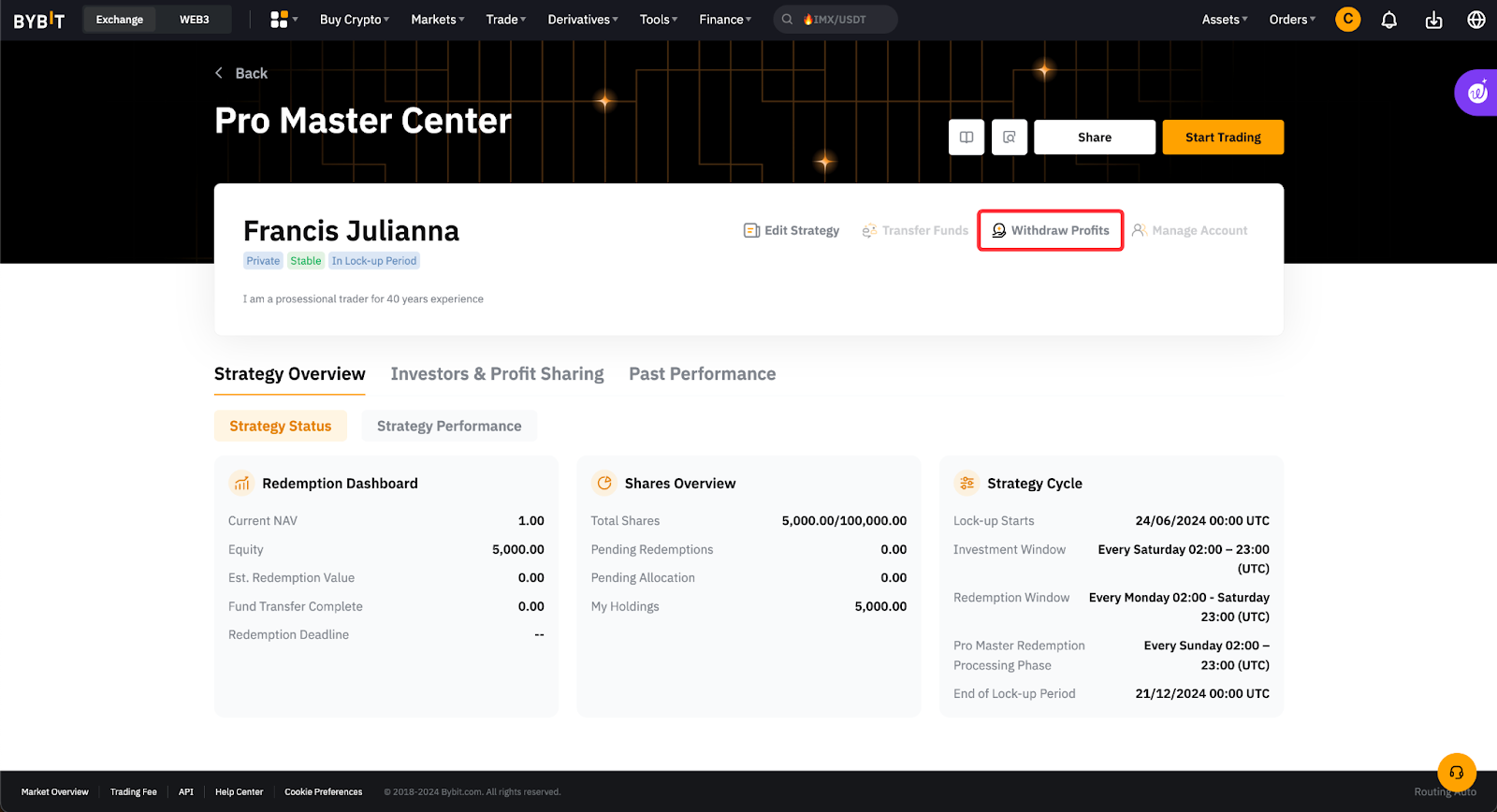 Pro 達人只能提取他們的利潤分成,而不能提取已實現的交易利潤。在贖回處理和結算階段,提取利潤分成將受到限制。如需瞭解分潤規則的相關詳情,敬請參閱本文。