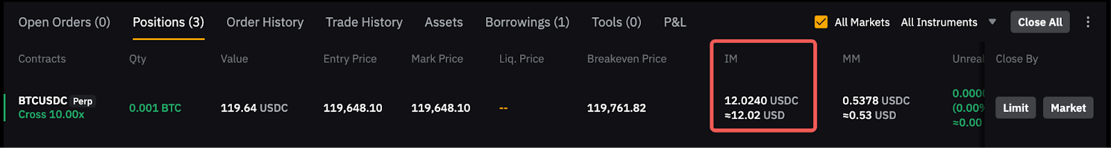 請注意,倉位選項卡中顯示的起始保證金包括 Taker 費,該費用可能會在平倉時產生。