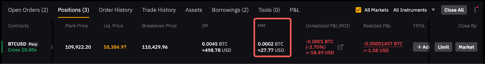 您會注意到,由於倉位選項卡顯示的 MM 包含平倉預估費用,因此 MM 會更高。